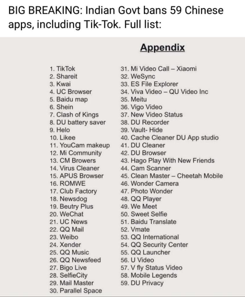 ସରକାରଙ୍କ ପକ୍ଷରୁ ଜାରି ଆଦେଶ ଅନୁଯାୟୀ, ସରକାର ସେହି ୫୯ ମୋବାଇଲ ଆପ୍ ଉପରେ ବ୍ୟାନ୍ ଲଗାଇଛନ୍ତି ଯାହା ଦେଶର ସାର୍ବଭୌମତ୍ଵ ଓ ଅଖଣ୍ଡତା, ଦେଶର ରକ୍ଷା, ରାଜ୍ୟର ସୁରକ୍ଷା ଏବଂ ସାର୍ବଜନୀନ ବ୍ୟବସ୍ଥା ପାଇଁ ବିପଦ ସୃଷ୍ଟି କରିଥିଲା। ଟିକ୍ଟକ୍ ସମେତ ଏଥିରେ ୟୁସି ବ୍ରାଉଜର, ସେୟାର ଇଟ୍, ହେଲ ପରି ୫୯ ଆପ୍ ସାମିଲ।